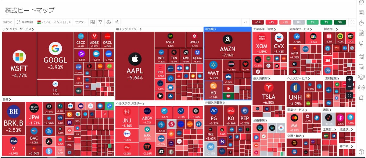 米国市場は暴落となっており、ほとんどのセクターが下落している状況となっています。