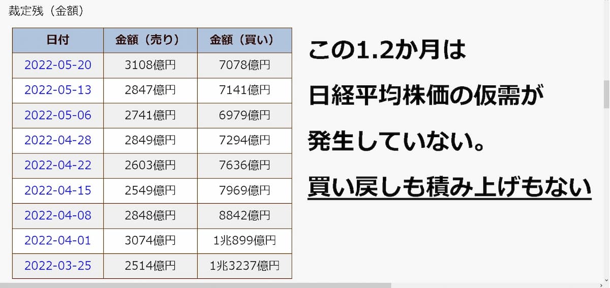 また図の裁定残の動きをみると、この約2カ月の間は日経平均の仮需が発生していません。