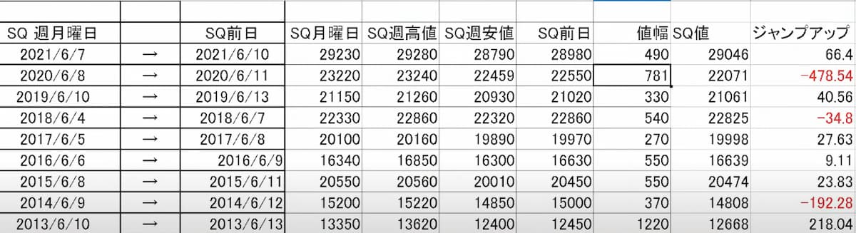 表のジャンプアップとはSQ前日終値とSQ値にどれくらいの乖離があったのかを示しています。