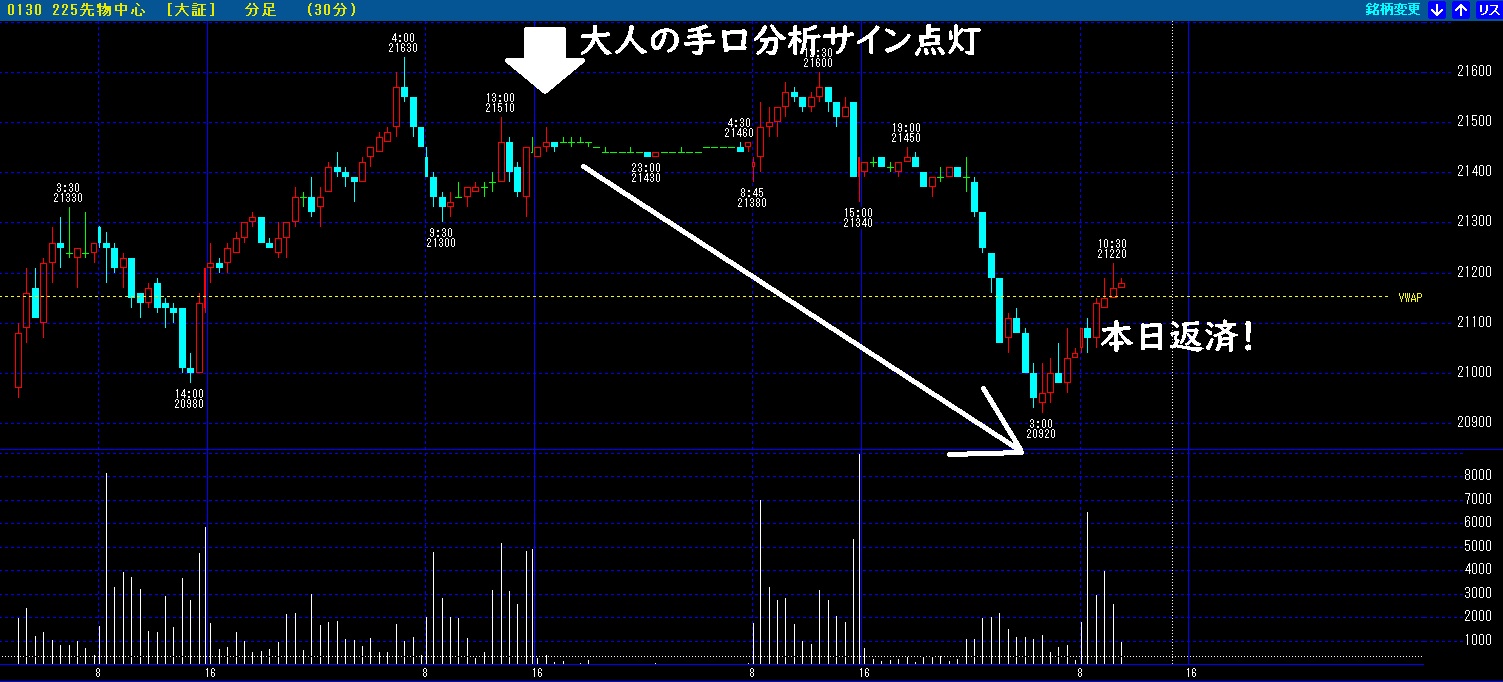 結果、夜間含めると売り値から500円以上下落した売りサインの出来上がり。