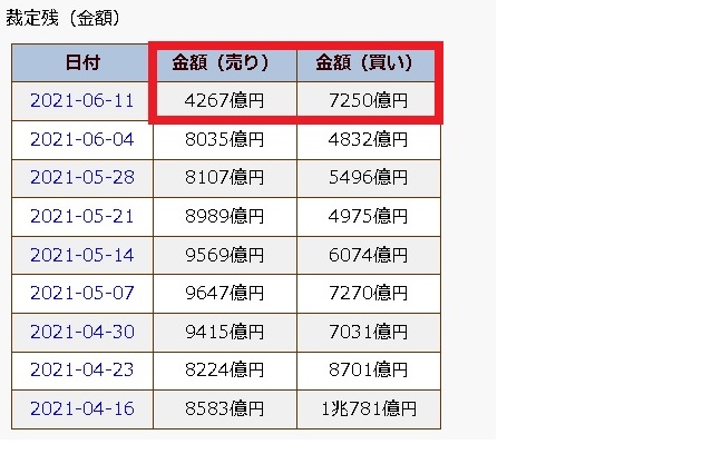 裁定売り残が4200億円、買い残が7200億円となっています。
