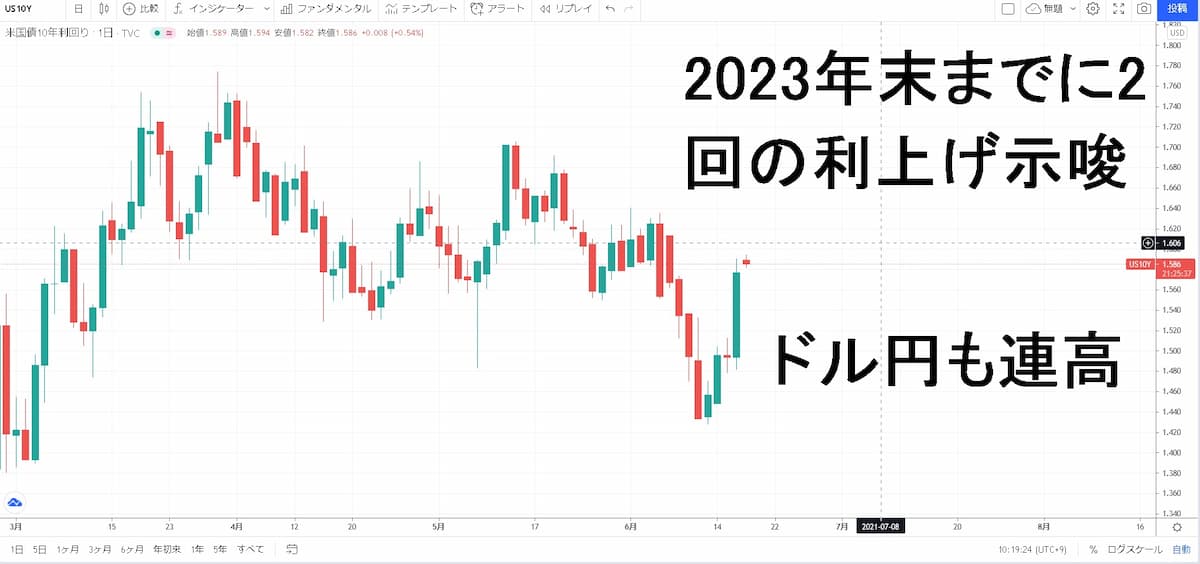 2023年末までに2回の利上げを示唆されたことでドル円も連れ高となりました。