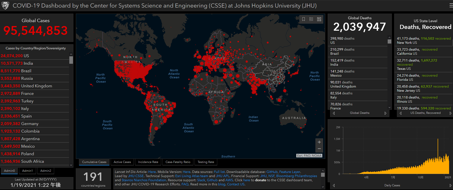 ジョンズホプキンス大のHPで確認出来る統計データを見ると、