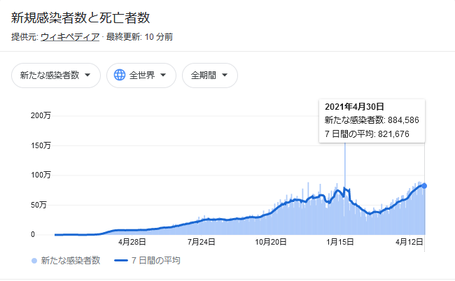 一方、過去最高値を更新しているのが世界の新型コロナウイルス新規感染者数。