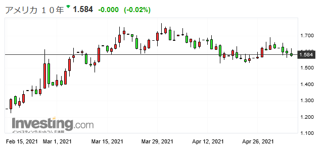 連休前に上昇していた米長期金利は上昇一服。現在1.58%辺り。