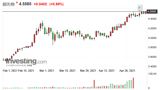 最近話題の銅価格も非常に強く10年ぶりの高値圏で推移していますが、