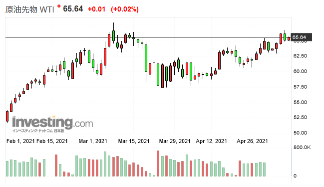 WTI原油先物は現在威張れる65ドル台で3月につけた高値を窺う動きとなっています。